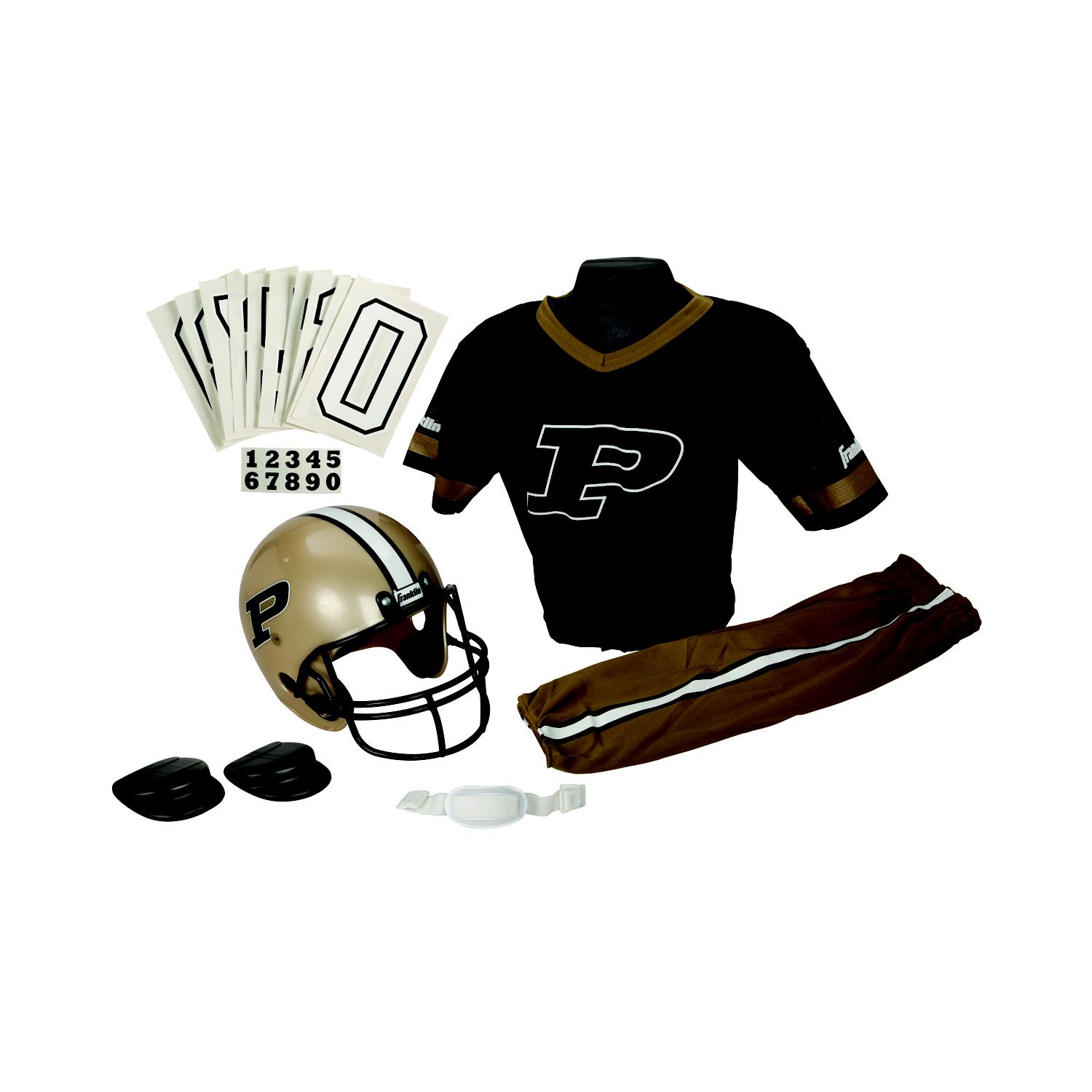 This authentic College Football Deluxe Team youth uniform set outfits your young fan in an authentic-looking team logo helmet, jersey and pants. The jersey and pants feature a double-knit polyester construction for lasting wear. Features Purdue University colors and logo Size: Small, medium Set includes: Team helmet, jersey with integrated shoulder pads, pants, helmet chin strap, iron-on number kit (from 0-9) and a helmet number decal kit (from 0-9) Polyester-mesh team jersey with integrated, removable, plastic shoulder pads Double-knit polyester team pants with elastic waistband and cuffs Size small fits ages 4 to 6 years old, size medium fits ages 7 to 10 years old Measurement Guide Child's Sizing Guide 100-percent polyester Machine washable Model: 15501F20P1Z WARNING: Helmet must not be used as protective equipment in football or any other contact sport.