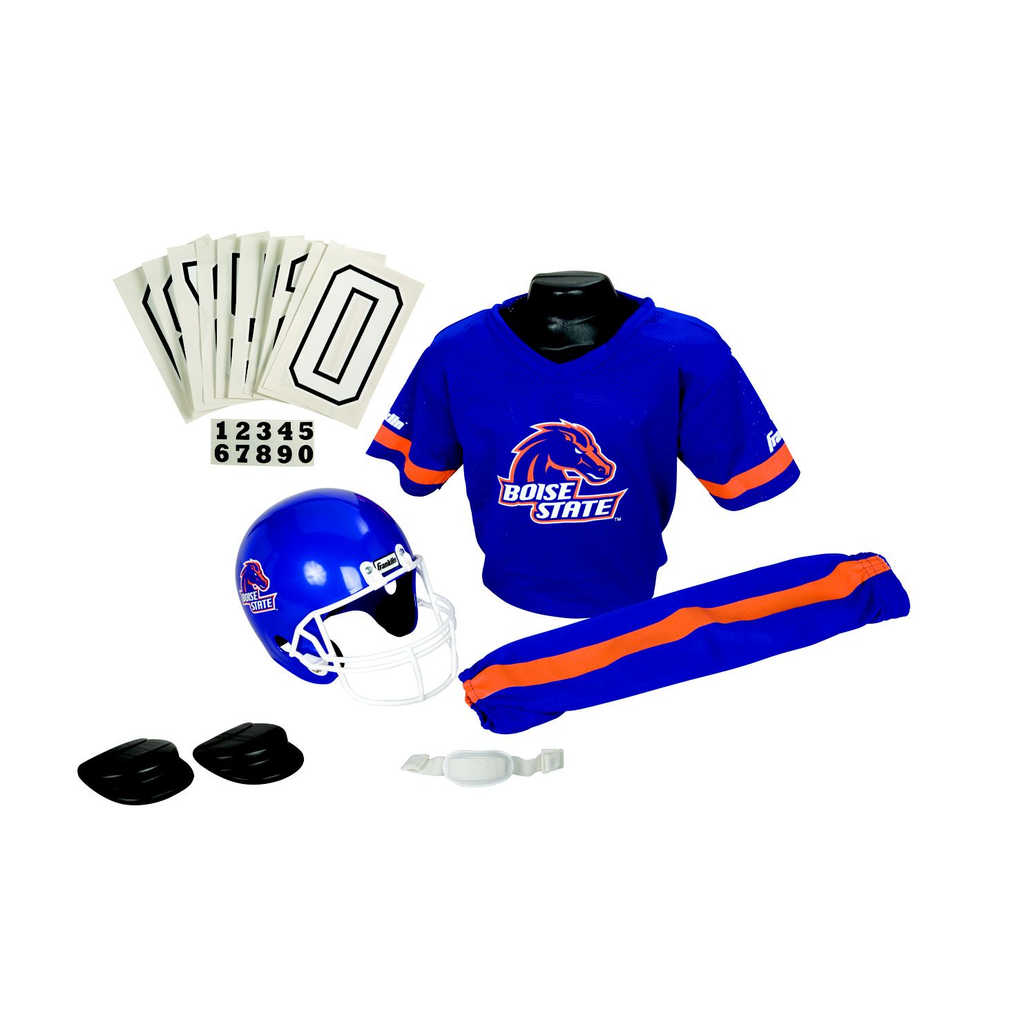 This authentic College Football Deluxe Team youth uniform set outfits your young fan in an authentic-looking team logo helmet, jersey and pants. The jersey and pants feature a double-knit polyester construction for lasting wear. Features Boise State colors and logo Size: Small, medium Set includes: Team helmet, jersey with integrated shoulder pads, pants, helmet chin strap, iron-on number kit (from 0-9) and a helmet number decal kit (from 0-9) Polyester-mesh team jersey with integrated, removable, plastic shoulder pads Double-knit polyester team pants with elastic waistband and cuffs Size small fits ages 4 to 6 years old, size medium fits ages 7 to 10 years old Measurement Guide Child's Sizing Guide 100-percent polyester Machine washable Model: 15501F69P1Z WARNING: Helmet must not be used as protective equipment in football or any other contact sport.