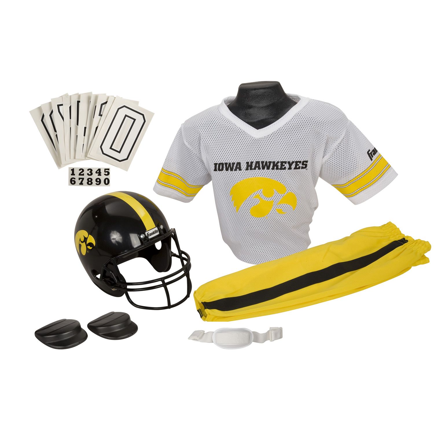 This authentic College Football Deluxe Team youth uniform set outfits your young fan in an authentic-looking team logo helmet, jersey and pants. The jersey and pants feature a double-knit polyester construction for lasting wear. Features Iowa colors and logo Size: Small, medium Set includes: Team helmet, jersey with integrated shoulder pads, pants, helmet chin strap, iron-on number kit (from 0-9) and a helmet number decal kit (from 0-9) Polyester-mesh team jersey with integrated, removable, plastic shoulder pads Double-knit polyester team pants with elastic waistband and cuffs Size small fits ages 4 to 6 years old, size medium fits ages 7 to 10 years old Measurement Guide Child's Sizing Guide 100-percent polyester Machine washable Model: 15501F31P1Z WARNING: Helmet must not be used as protective equipment in football or any other contact sport.