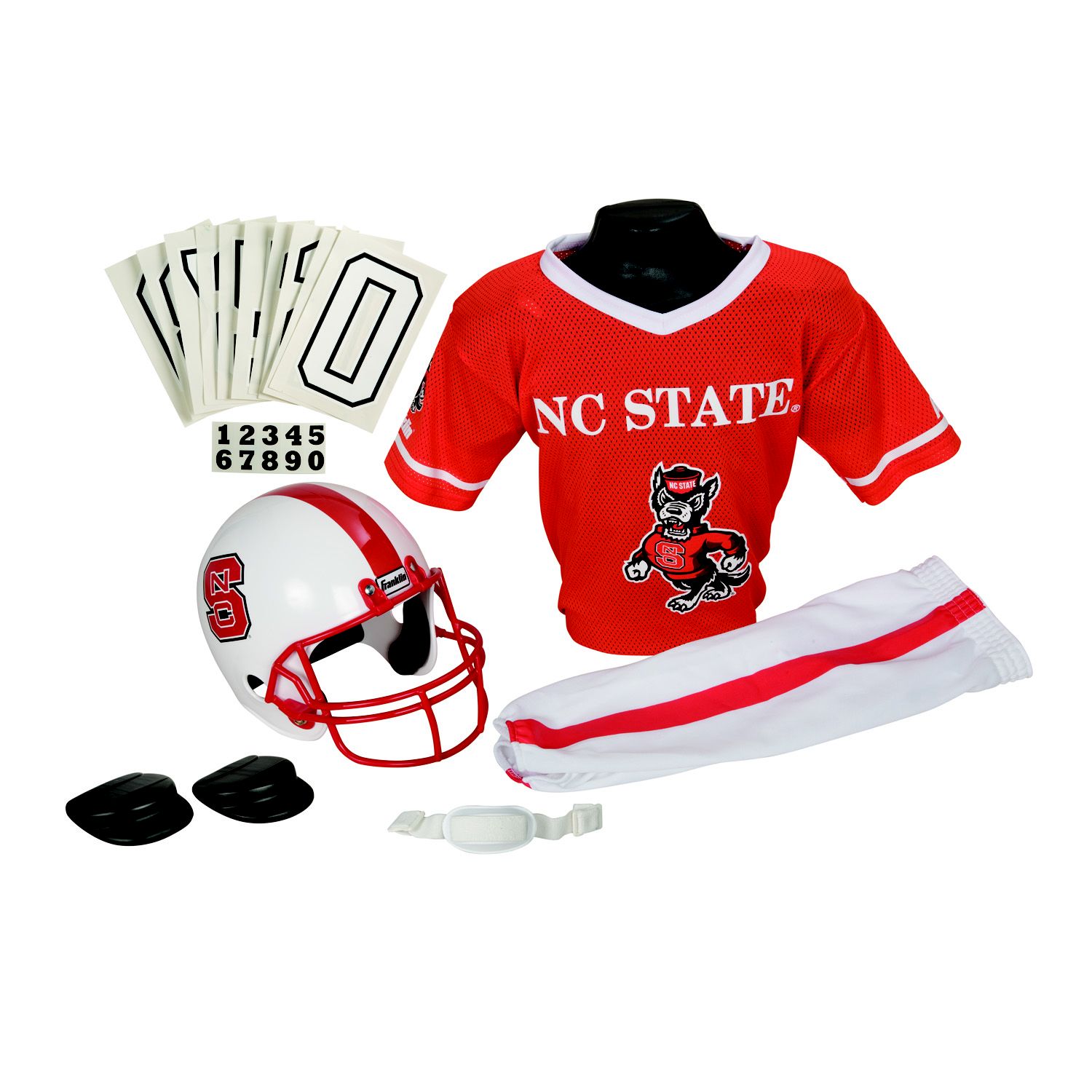 Franklin Sports 15501F33P1Z COL NC STATE Medium Uniform Set This authentic College Football Deluxe Team youth uniform set outfits your young fan in an authentic-looking team logo helmet, jersey and pants. The jersey and pants feature a double-knit polyester construction for lasting wear. Features NC State colors and logo Size: Small, medium Set includes: Team helmet, jersey with integrated shoulder pads, pants, helmet chin strap, iron-on number kit (from 0-9) and a helmet number decal kit (from 0-9) Polyester-mesh team jersey with integrated, removable, plastic shoulder pads Double-knit polyester team pants with elastic waistband and cuffs Size small fits ages 4 to 6 years old, size medium fits ages 7 to 10 years old Measurement Guide Child's Sizing Guide 100-percent polyester Machine washable Model: 15501F33P1Z WARNING: Helmet must not be used as protective equipment in football or any other contact sport.